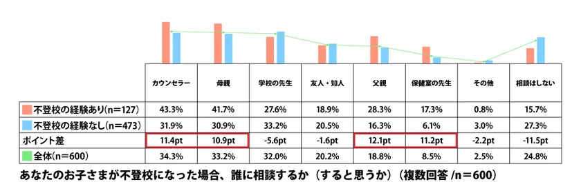 もしお子さまが不登校になった場合、誰に相談するかを聞くと、最も多い回答は「カウンセラー」となり34.3%が回答しました。次いで、「母親」「学校の先生」と続きます。不登校経験者は家族を含め、多くの選択肢で高い数値となっています。