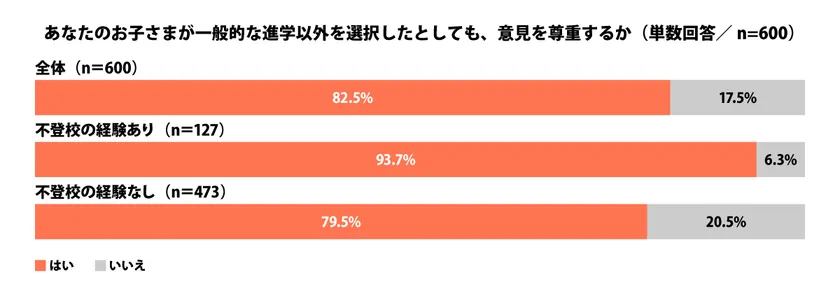 お子さまが一般的な進学以外を選択したとしても、お子さまの意見を尊重するかと聞くと、82.5%が「はい」と回答しました。不登校経験者は93.7%が「はい」と回答しています。
