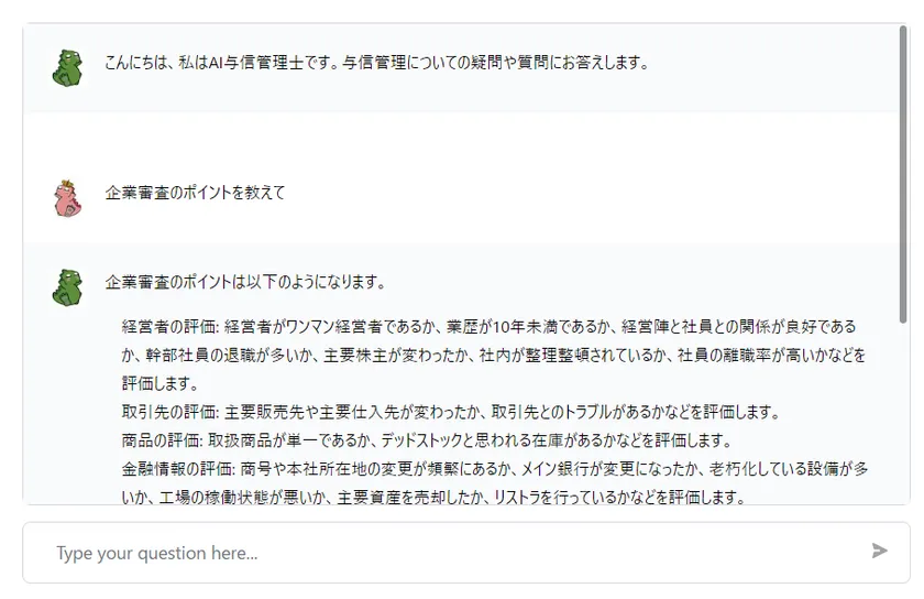 <質問例> 「企業審査のポイントを教えて」、「売掛債権回転期間とは?」