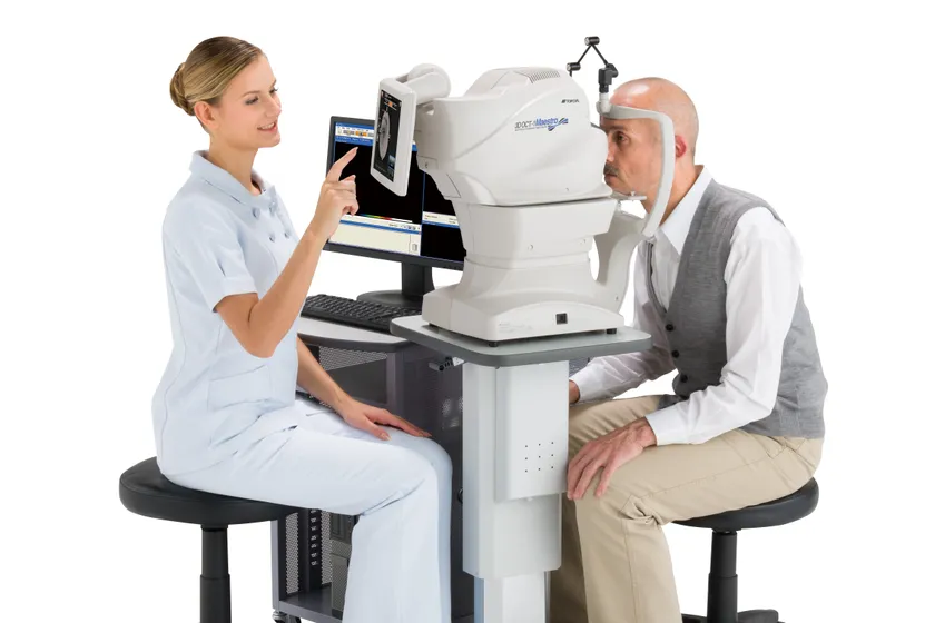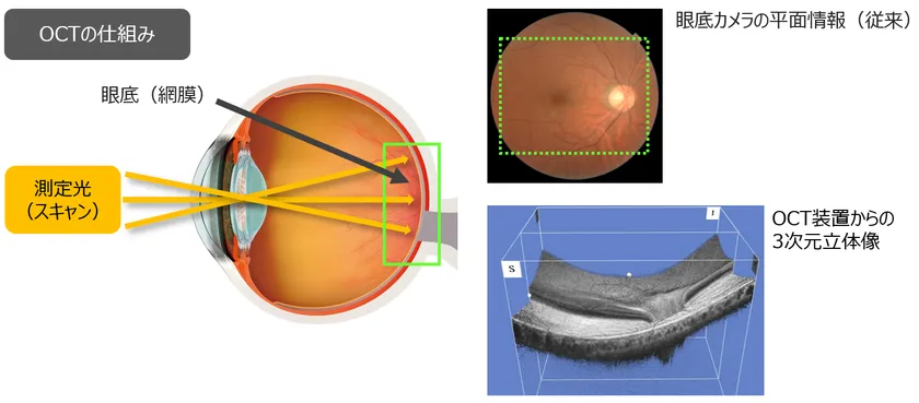 眼底検査において、眼底の網膜表面を撮影する従来の眼底カメラに対し、OCTは眼底に不可視光を当て、反射した光を解析することで、非侵襲で(身体に負担を与えずに)眼底の3次元立体像を取得できます。