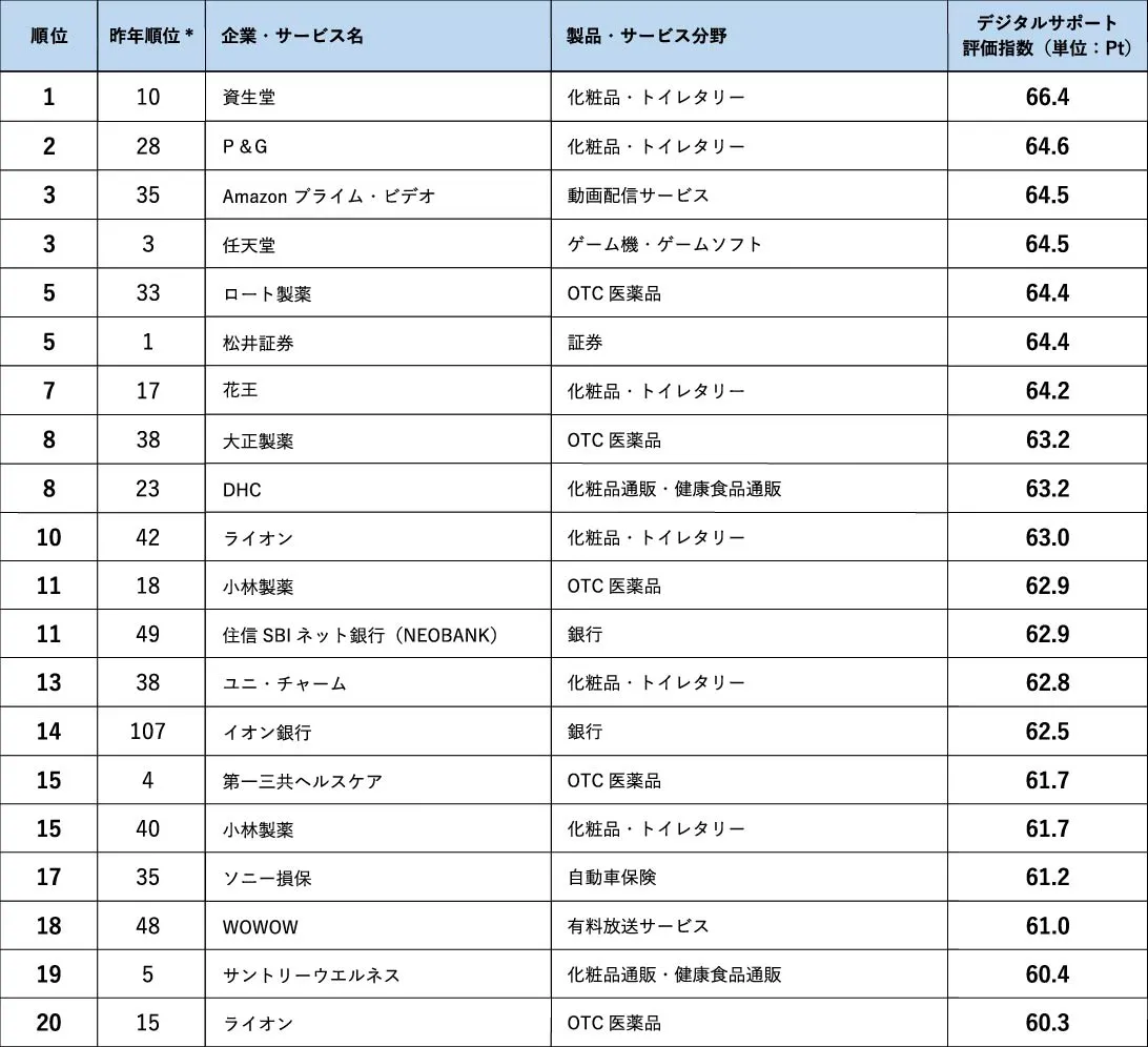 (*)昨年順位は企業の「サポートサイト」を評価対象としたサポートサイト評価指数ランキングの結果。今年度から「公式サイト・公式アプリ・LINE公式アカウント」へ評価範囲を拡大している。