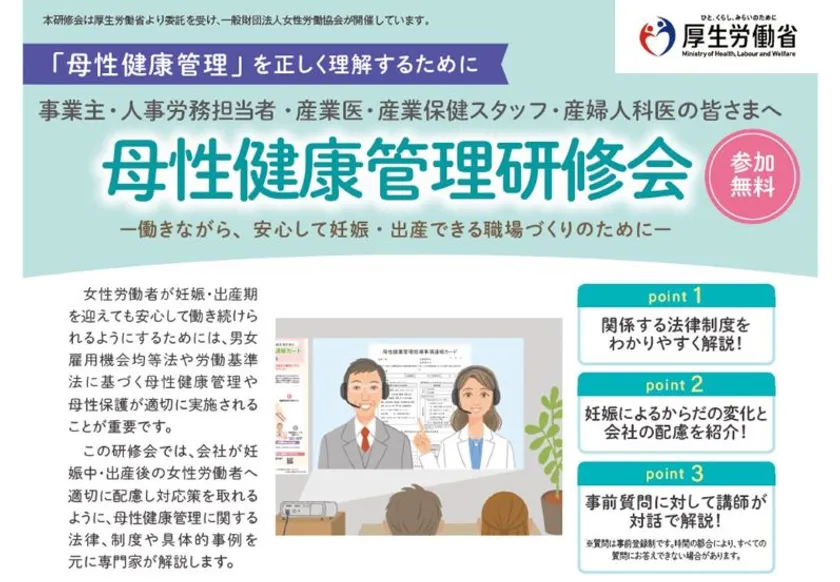 一般財団法人 女性労働協会(所在地:東京都港区、代表:岩田 三代)は、厚生労働省委託事業「母性健康管理等推進支援事業」において、「母性健康管理研修会」を令和5年10月から12月までに全3回、オンライン形式で開催します。
