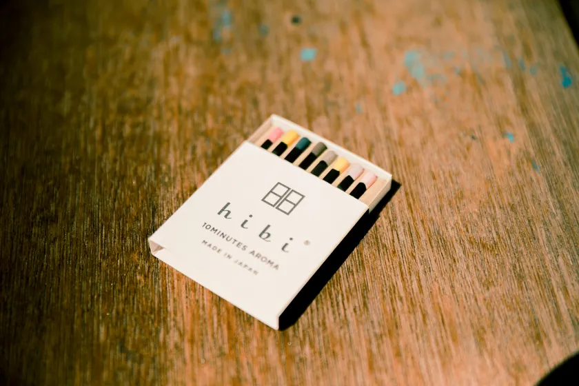 東京蔵前店と本社敷地内ファクトリーショップでは、16種の〈hibi〉のラインナップが並び、スタッフが実際に火をつけて香りのテイスティングをお手伝いします。好きな香調やなりたい気分に合わせて、スタッフがお見立てすることも可能。オリジナルデザインの白い8本入りマッチ箱風ボックスに、ご自分だけのアソートを作ってお持ち帰りいただけます。