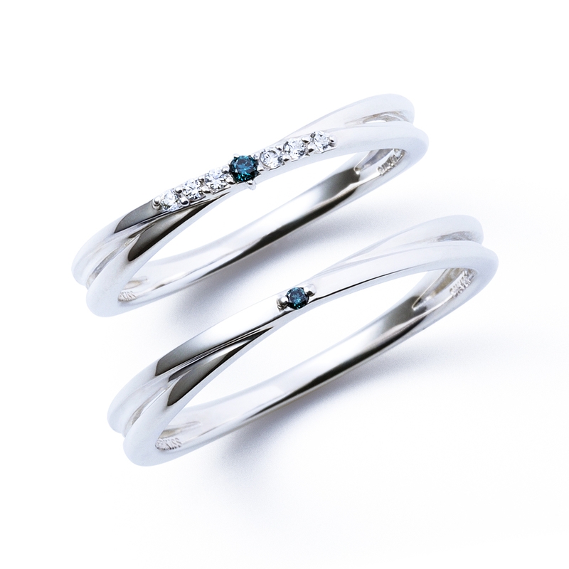 幸運を象徴するブルーダイヤモンドをセットしたクロッシングモチーフのペアリング。