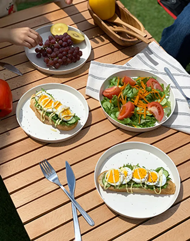 樹脂製だから軽くて“落としても割れにくい”、そして電子レンジや家庭用食器洗い機でも使用できる手入れのしやすい器です。熱いものを入れても熱が伝わりにくいので手で持つことができ、料理も選びません。また、キャンプなどのアウトドアを楽しむときも、軽さとコンパクト収納は大きな武器となり、ボウルとプレートのフタはカッティングボードとして使用可能な設計になっています。家族4人や友人4人でインドアからアウトドアまで使える、新しい食器の提案です。