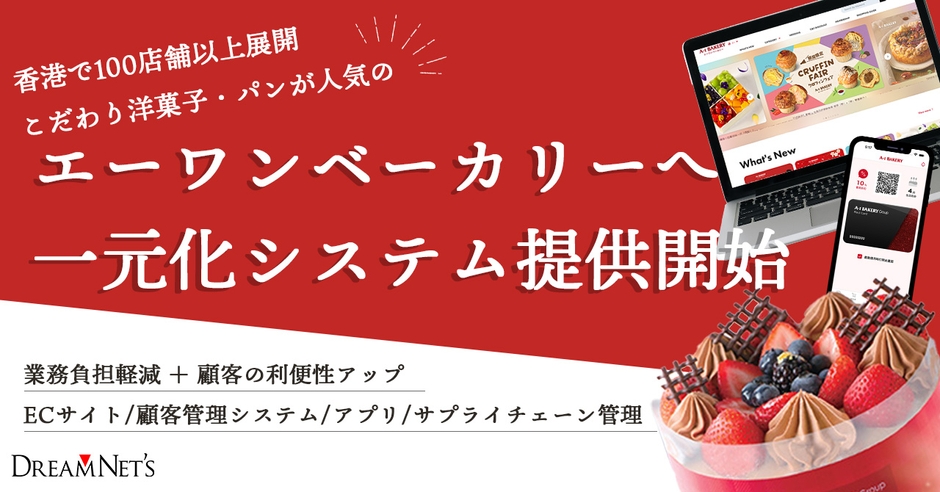 Webシステム開発会社である株式会社ドリームネッツ(本社:広島県福山市、代表取締役社長:井上 一成)は、香港を中心に100店舗以上を展開、こだわりの洋菓子・パンを製造・販売しているA-1 BAKERY CO.,(HK) LTD. (本社:香港、代表取締役社長:楊井 元伸)のWeb+店舗の受発注統合システムを開発。