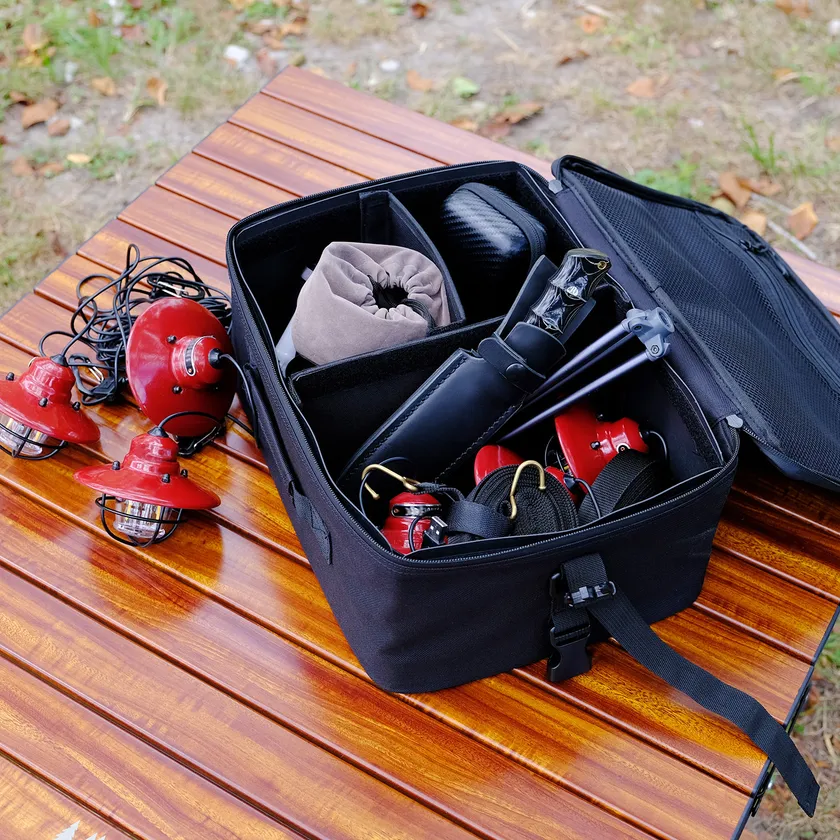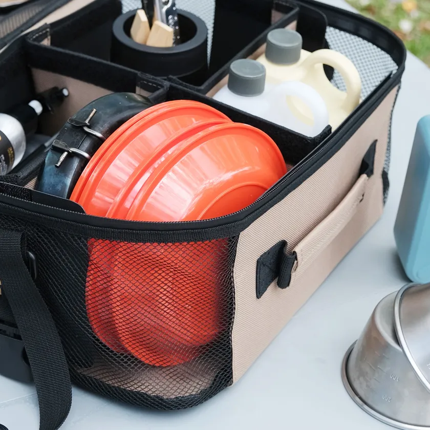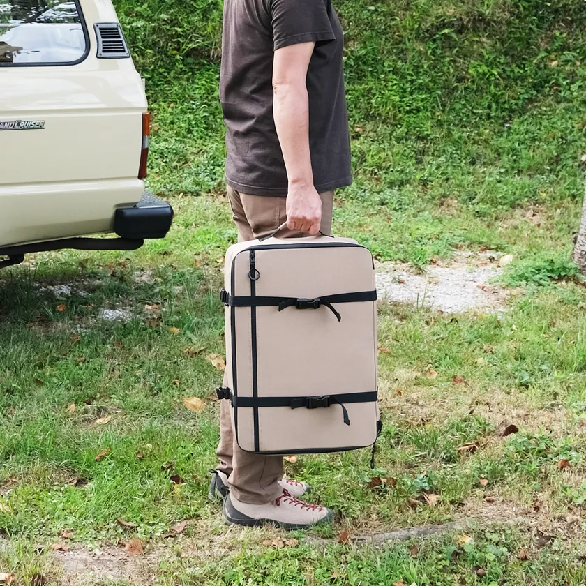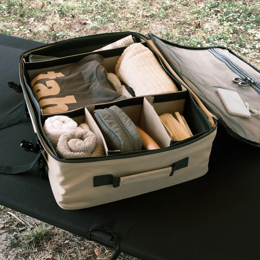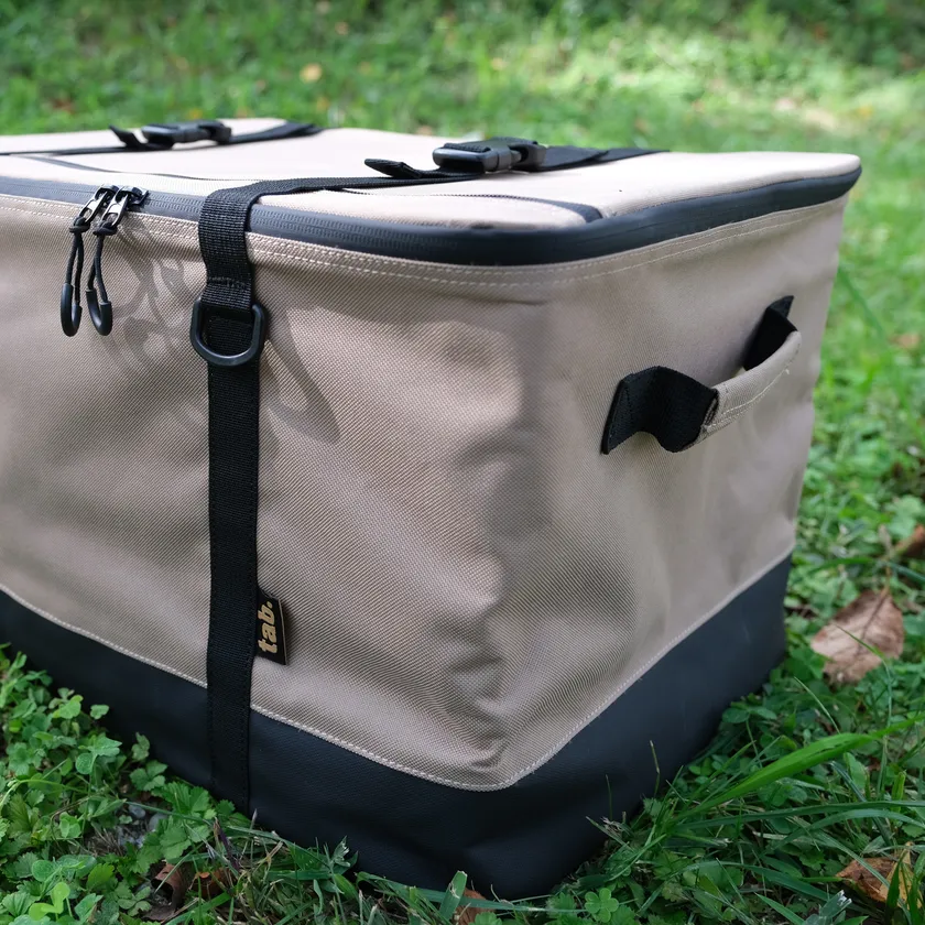 本体は600デニールの高密度ポリエステルを使用。裏側はPVCコーティング、ファスナーはすべて止水ファスナーで、急な天候不良でもコンテナへの水の侵入を防ぎます。底面もPVCコーティングとなっているため、地面に置いても水濡れせず、汚れも落ちやすいのでお手入れも簡単です。(※完全防水ではございません。)