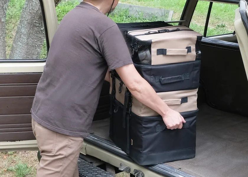 秘密は側面に取り付ける「補強板」。4つの側面に面ファスナーで取り外し可能な補強板を入れることで、コンテナ内の形をキープ。中身のバランスが悪くてもコンテナの形が崩れにくく、形が崩れないからハードコンテナのように積み重ねて使うことが可能に。