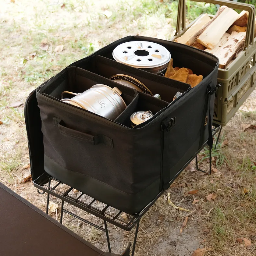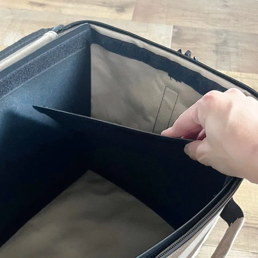 4面の補強板は取り外し可能。全て外すと通常のソフトコンテナとして使用できます。また、SとMには大1枚と小2枚、LとLLには大2枚と小2枚の可動式仕切り板が付属。面ファスナーで好きな位置に取り付けられて、入れるものに合わせてアレンジできます。