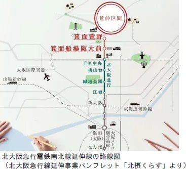 箕面市と北大阪急行電鉄では、北大阪急行電鉄南北線を千里中央駅から北へ約2.5km延伸し、「箕面船場阪大前駅」と「箕面萱野駅」の2駅を新設する工事を進めています。その工事も順調に進捗しており、各種試験や検査の実施に概ね目処をつけたことなどを総合的に判断し、北大阪急行電鉄南北線延伸線の開業日を2024年(令和6年)3月23日(土)に決定しました。
