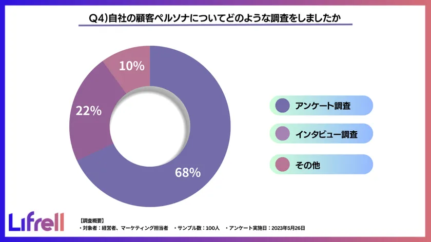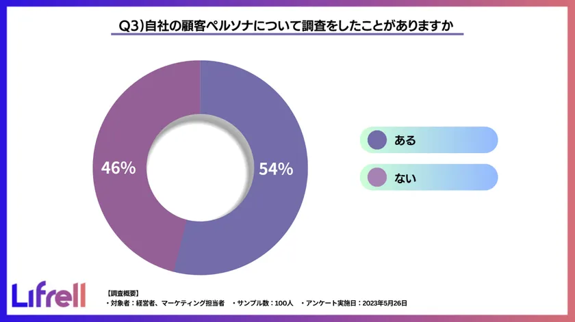 この度、売上アップにコミットすることをミッションとし、デジタルマーケティングの戦略立案から実行までを支援している株式会社LIFRELL(本社:東京都渋谷区 代表取締役:佐藤 祐介)は、企業の経営者・マーケター100名を対象に「企業の顧客ペルソナ把握に関するアンケート調査」を行いました。