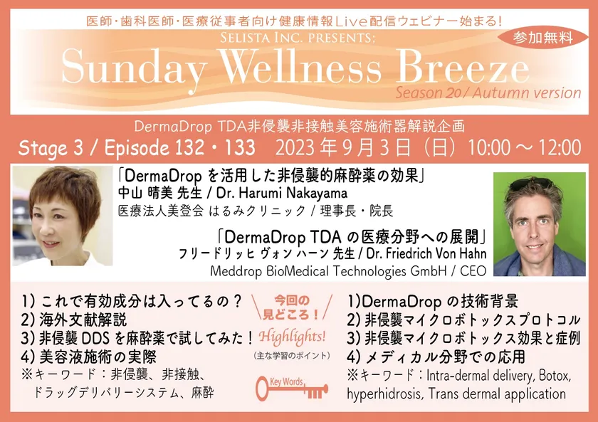 《医師・歯科医師・薬剤師向け》 無料オンラインセミナー9/3(日)朝10時開催 『DermaDrop TDA非侵襲・ 非接触美容施術器の医療分野への展開』 講師:Dr. Friedrich Von Hahn (Meddrop BioMedical Technologies GmbH/CEO)、 中山 晴美先生(医療法人美登会はるみクリニック/理事長・院長)