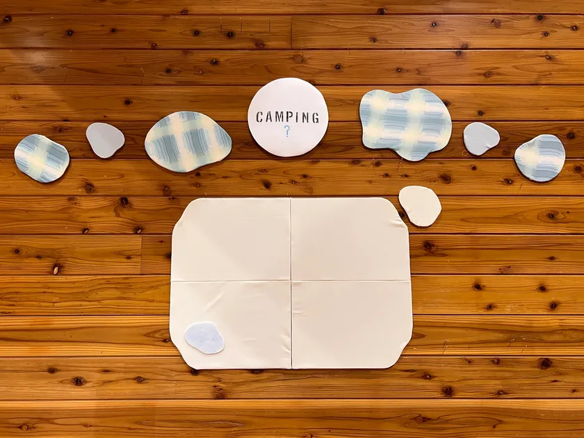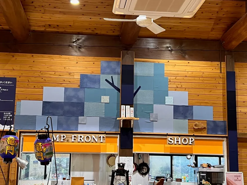 *今回、施工したドラゴンキャンプ場は、竜門ダム湖畔に所在するキャンプ場となります。木と水が豊かな竜門ダムという自然に恵まれたロケーションのため、今回は「森(木)と水」をテーマにフロント館内の壁面を彩りました。