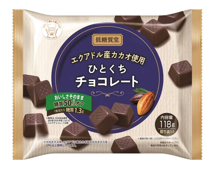 エクアドル産カカオを使用し、風味豊かに仕上げました。甘味料不使用でビターな味わい、糖質50%*オフでロカボマーク認定のひとくちチョコレートです。
