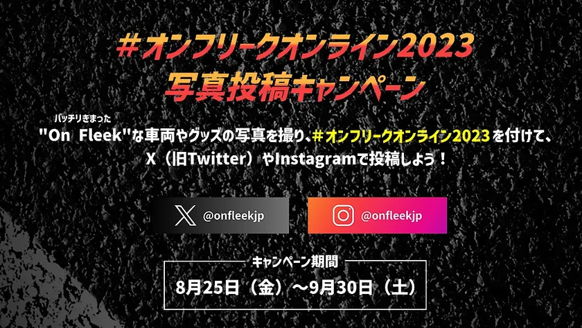 今回のオンラインイベントは、自身で撮影したOn Fleek(バッチリ決まった)な愛車の写真を、公式SNSをフォローし、ハッシュタグ「#オンフリークオンライン2023」を付けてX(旧Twitter)やInstagramに投稿するだけで、無料で参加できます。投稿した写真は公式ホームページに掲載され、抽選で30名の方にアワードや豪華商品がプレゼントされます。