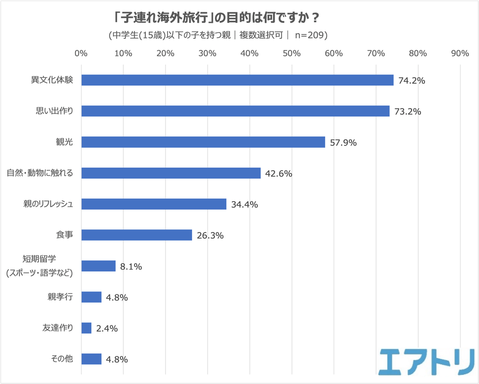 子連れ海外旅行における目的は、「異文化体験(74.2%)」、1ポイント差で「思い出作り(73.2%)」、次いで「観光(57.9%)」と続きました。
