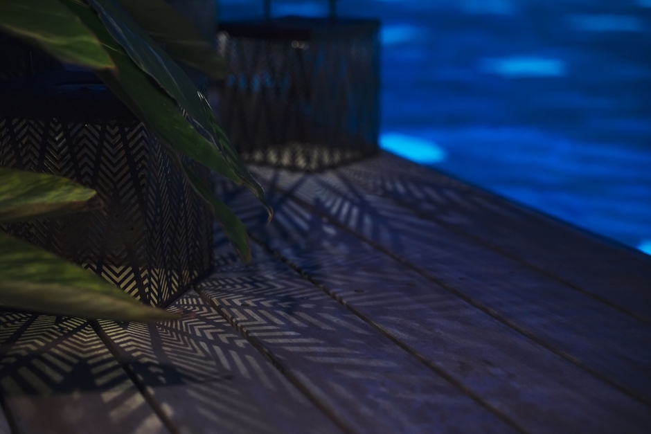 プールサイドでは、冬でも屋外で沖縄の自然を楽しめるように、植物を映し出し、植物の影を楽しんでいただけるようなライトアップを行います。植物の形をデザインに取り入れたオリジナルランタンに加え、プールサイドの木々には月灯かりのようなライティングを行い、ウッドデッキに木漏れ日のような光を映し出します。さらに、プールサイドのソファ上のシェードには、水面のような柔らかい光の揺らぎを投影し、幻想的な空間を演出します。水、風、植物が感じられる灯かりの中で、波音を聴きながら温かなプールに漂えば、沖縄の自然に包まれるような非日常の空間を楽しめます。
