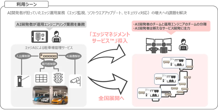 エッジAI(※5)を活用し、駐車場運営の効率化や高度化を実現する駐車場管理サービスにおいては、全国展開にあたり、AI開発者が担っていたエッジ運用業務(エッジ監視、ソフトウエアアップデート、セキュリティ対応)の増大が想定されます。「エッジマネジメントサービス(TM)」を導入すると、AI開発者以外によるエッジの運用管理が可能となります。AI開発者のチームと運用エンジニアのチームを分離し、サービス拡大に合わせた体制を確立し、サービス品質向上に加えAI開発者が新たなサービスの開発に注力する環境を実現します。