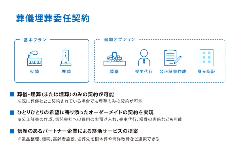 死後事務委任契約における葬儀・埋葬(または埋葬)のみに特化した契約形態です。ひとりひとりの希望に寄り添ったオーダーメイドの契約を実現します。依頼者の希望をかなえるため、一つ一つ丁寧にヒアリングを複数回行い、ご本人さまの中にあるイメージをしっかりと形にいたします。埋葬は、お墓を継ぐ人がいない方のための永代供養やお墓を持たない方のための海洋散骨に対応しています。