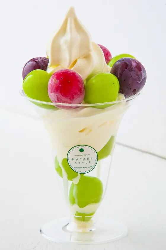 シャインマスカット、ピオーネ、クインニーナの3種類のぶどうと、山形県産の牛乳を使用したソフトクリームで作ったパフェ。