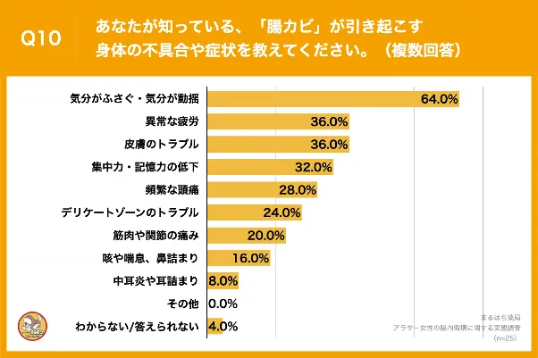 Q9で「言葉・意味ともに詳しく知っている」と回答した方に、「Q10.あなたが知っている、「腸カビ」が引き起こす身体の不具合や症状を教えてください。(複数回答)」(n=25)と質問したところ、「気分がふさぐ・気分が動揺」が64.0%、「異常な疲労」が36.0%、「皮膚のトラブル」が36.0%という回答となりました。