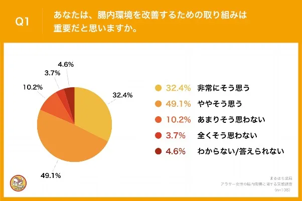 「Q1.あなたは、腸内環境を改善するための取り組みは重要だと思いますか。」(n=108)と質問したところ、「非常にそう思う」が32.4%、「ややそう思う」が49.1%という回答となりました。