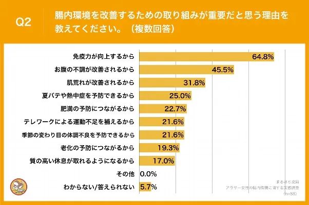 Q1で「非常にそう思う」「ややそう思う」と回答した方に、「Q2.腸内環境を改善するための取り組みが重要だと思う理由を教えてください。(複数回答)」(n=88)と質問したところ、「免疫力が向上するから」が64.8%、「お腹の不調が改善されるから」が45.5%、「肌荒れが改善されるから」が31.8%という回答となりました。