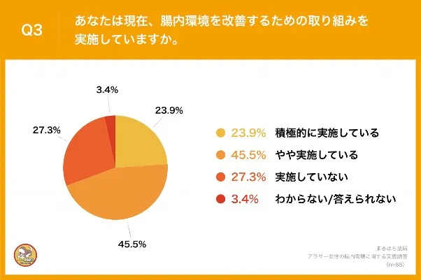 Q1で「非常にそう思う」「ややそう思う」と回答した方に、「Q3.あなたは現在、腸内環境を改善するための取り組みを実施していますか。」(n=88)と質問したところ、「積極的に実施している」が23.9%、「やや実施している」が45.5%という回答となりました。