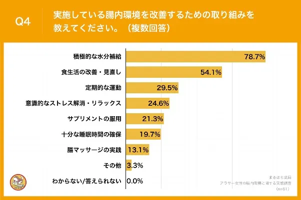 Q3で「積極的に実施している」「やや実施している」と回答した方に、「Q4.実施している腸内環境を改善するための取り組みを教えてください。(複数回答)」(n=61)と質問したところ、「積極的な水分補給」が78.7%、「食生活の改善・見直し」が54.1%、「定期的な運動」が29.5%という回答となりました。