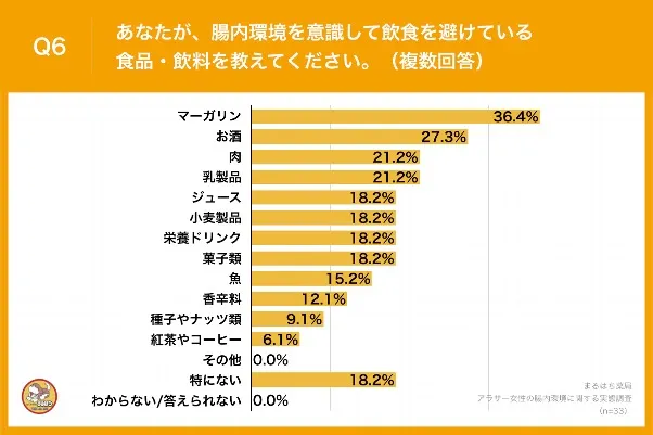 Q4で「食生活の改善・見直し」と回答した方に、「Q6.あなたが、腸内環境を意識して飲食を避けている食品・飲料を教えてください。(複数回答)」(n=33)と質問したところ、「マーガリン」が36.4%、「お酒」が27.3%、「肉」が21.2%、「乳製品」が21.2%という回答となりました。