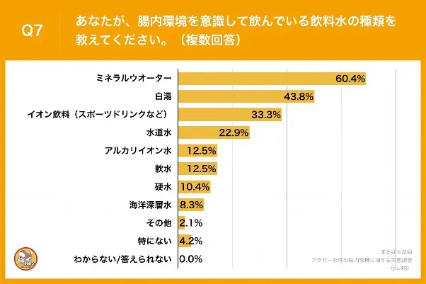Q4で「積極的な水分補給」と回答した方に、「Q7.あなたが、腸内環境を意識して飲んでいる飲料水の種類を教えてください。(複数回答)」(n=48)と質問したところ、「ミネラルウオーター」が60.4%、「白湯」が43.8%、「イオン飲料(スポーツドリンクなど)」が33.3%という回答となりました。