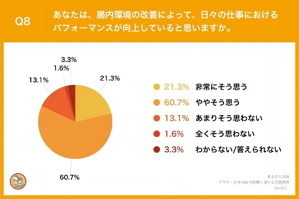 Q3で「積極的に実施している」「やや実施している」と回答した方に、「Q8.あなたは、腸内環境の改善によって、日々の仕事におけるパフォーマンスが向上していると思いますか。」(n=61)と質問したところ、「非常にそう思う」が21.3%、「ややそう思う」が60.7%という回答となりました。