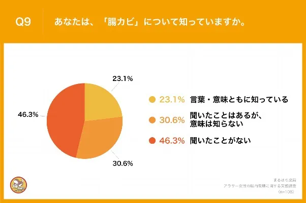 「Q9.あなたは、「腸カビ」について知っていますか。」(n=108)と質問したところ、「言葉・意味ともに知っている」が23.1%、「聞いたことはあるが、意味は知らない」が30.6%という回答となりました。