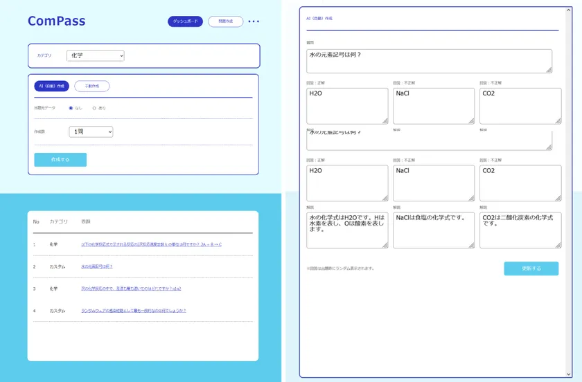 Compassは、最先端のAI技術を駆使した問題自動生成機能を特徴とする、未来志向のe-Learningサービスです。学習者はAIが生成する多彩な問題によって実践的なスキルを磨き、教育者は簡単なインターフェースを通じて「セキュリティ」や「コンプライアンス」など作りたいテーマの問題を自動生成の上、編集管理ができます。