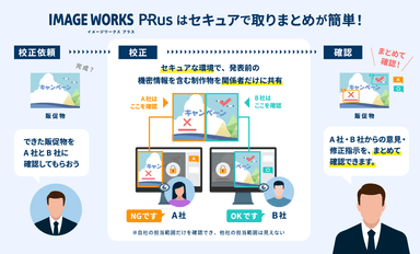 本日提供を開始する「IMAGE WORKS PRus」は、オンライン上で複数人が同時にコメントを書き込みながら校正作業を行えるため、高品質な制作物の作成を円滑に進めることができます。さらに、2023年11月には、当社独自の「切り取り機能」※2「取りまとめ機能」※2を搭載予定。「切り取り機能」は、社内・制作会社・取引先などの関係者それぞれに見せたい部分だけを切り取って共有し、校正依頼を行うことができます。また「取りまとめ機能」は、校正依頼者が関係者間でお互いの修正指示が見えない設定で校正を依頼することが可能。それぞれの関係者からの修正指示も一元的に確認できます。