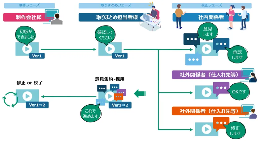 ・「取りまとめ機能」は、校正依頼者が関係者間でお互いの修正指示が見えない設定で確認依頼を行うことができるため、意図しない情報漏洩を防ぐことができます。また校正依頼者は、それぞれの校正者からの指示を一元的に確認することも可能。紙に出力せずに修正指示をまとめて確認できるため、在宅勤務などの多様な働き方にも対応し、制作物の作成業務のDXに貢献します。