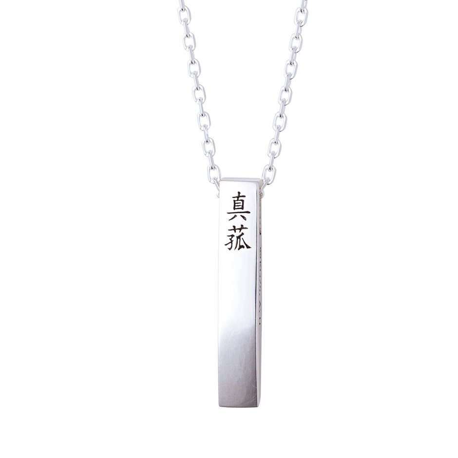 表面には花模様と厄除の面をモチーフにデザインへ取り込み、裏面には名前の「真菰」を黒いぶしで刻印しました。