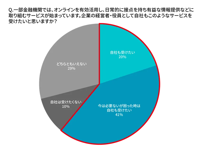 (9)では、オンラインを効率よく取り入れるにしても、具体的にどのように取り入れるのか?というのが最後の質問です。「一部金融機関では、オンラインを有効活用し、日常的に接点を持ち有益な情報提供などに取り組むサービスが始まっています。企業の経営者・役員として自社もこのようなサービスを受けたいと思いますか?」という質問に対し、「自社も受けたい」は61%に及びました。