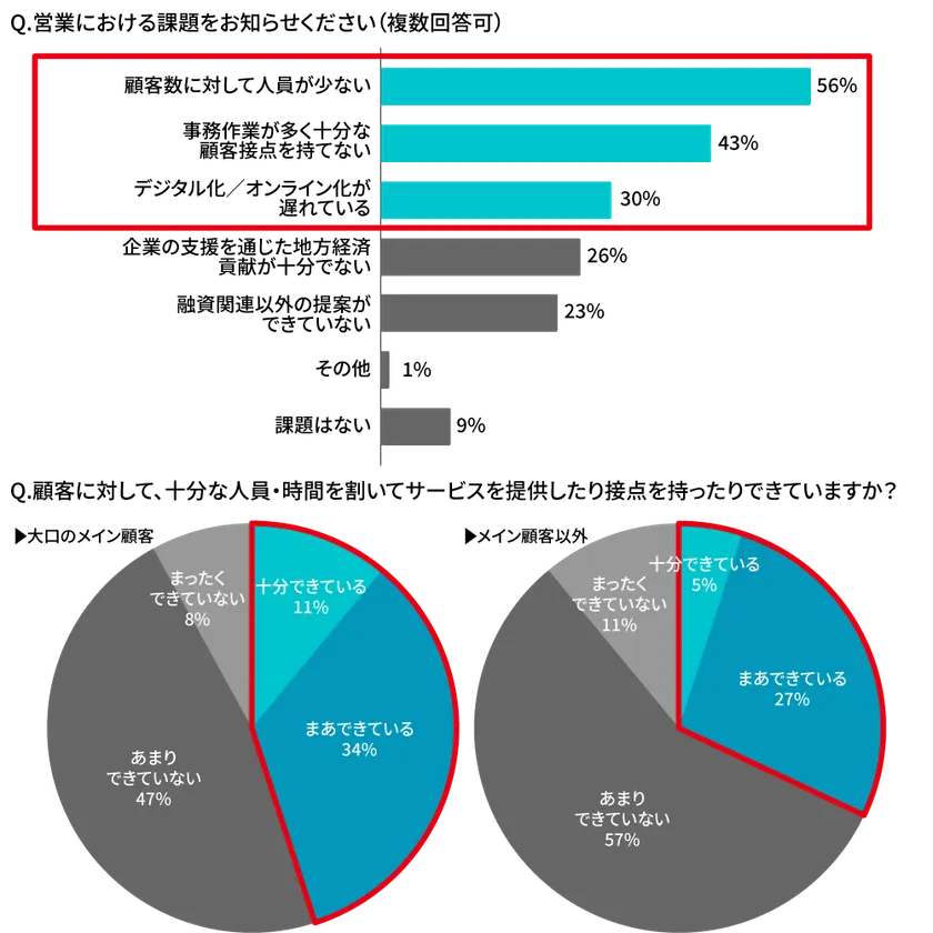 さらに、「大口取引が多い重要顧客に対して、十分な人員・時間を割いてサービスを提供したり接点を持ったりできていますか?」との質問に「できている」と答えた方は、45%にとどまりました。同様に、「メイン顧客層ではない中小・零細企業といった顧客」に対して「できている」と回答した方はわずか32%でした。地方銀行にとって「距離の近さ」はお家芸とも呼べるものであるはずが、フェイストゥフェイスを十分に発揮できているとは言い難い状況であることが明らかになりました。なんとかしてこれを解消しないことには、主要業務すらままならず、コンサルティング営業への転換は難しいでしょう。
