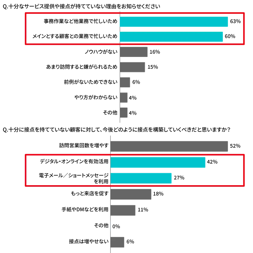 (4)十分なサービス提供や接点が持てていない理由を改めて深掘りすると、やはり「メインとする顧客との業務で忙しい」「事務作業など他業務で忙しい」が圧倒的2トップで、これを解消することが鍵になると考えられます。