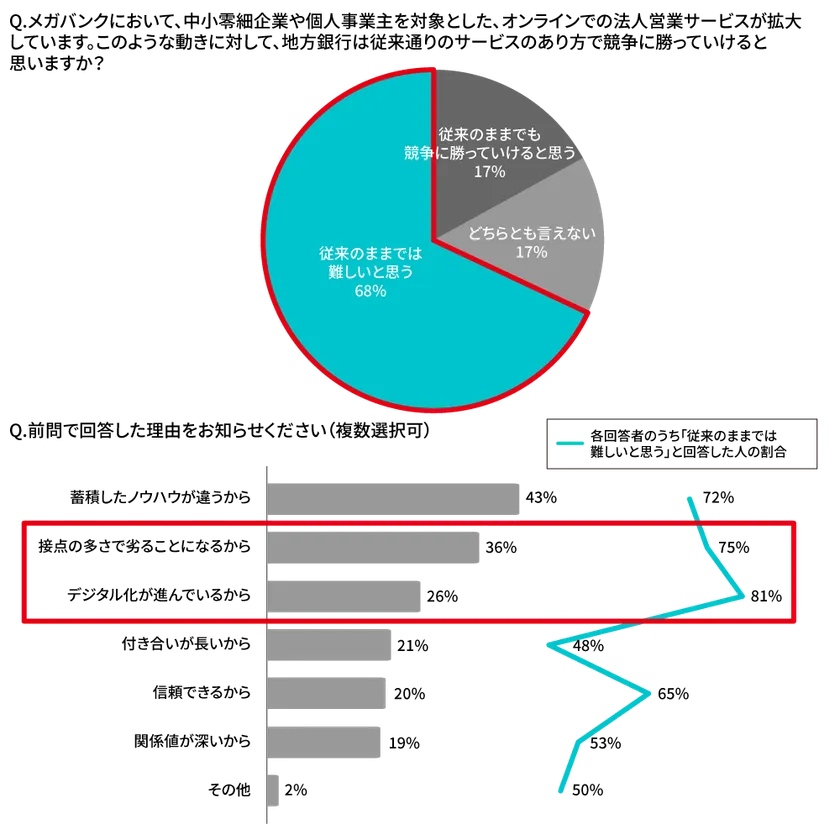(7)(8)一方、メガバンクにおいて顧客との「接点」を中心とした法人営業の取り組みが始まっていることをご存知でしょうか。法人営業の方には、最後に率直な質問を投げかけています。メガバンクが中小企業を対象としたオンラインでの営業を活発化してきているなかで、地方銀行と競争になった時、従来のままの銀行の姿で競争に勝てると思うか?というものです。「従来のままでは難しいと思う」と思うと回答した方は68%に上りました。現場の肌感として、すでに「距離の近さ」では接点構築において訪問だけではデジタルに勝てないと感じているようです。また理由において「接点の多さで劣ることになるから」の回答は36%に上り、いかに現場が接点の多さを本来大切にしたいと考えているかがわかると同時に、数少ない訪問ではオンラインによる接点数の多さには勝てないと考えていることがわかります。