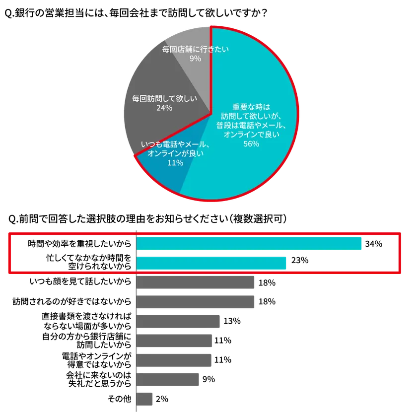 (5)(6)そもそも顧客側は、銀行の営業担当に毎回会社まで訪問してほしいと思っているのでしょうか?調査の結果、「毎回訪問してほしい」と回答したのは24%にとどまり、「普段は電話やメール、オンラインで良い」の半数以下という結果に。重要な時は顔を合わせたいが、それは毎回ではない、というのが実は顧客側も本音であると言えます。