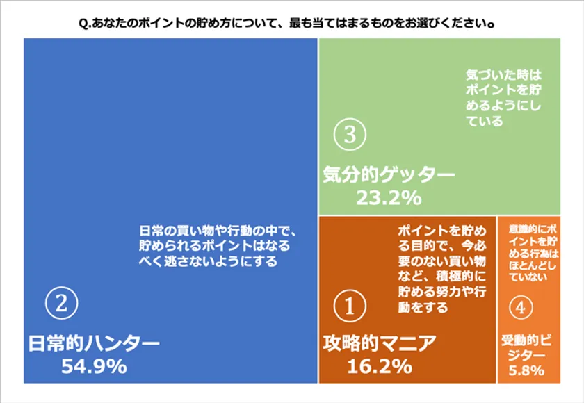 ポイントの貯め方について、「日常の買い物や行動の中で、貯められるポイントはなるべく逃さないようにする」と回答した【日常的ハンター】が54.9%と多数派であることがわかりました。また、「ポイントを貯める目的で、今必要のない買い物など、積極的に貯める努力や行動をする」を選択した、最も積極的なタイプである【攻略的マニア】は16.2%で、この2つのタイプで全体の71.1%を占めています。