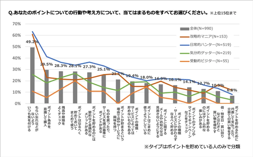 ポイントに対する行動や考え方を聞いた結果では、「もらい忘れなどがないよういつも気を付ける」が【攻略的マニア】【日常的ハンター】共に、約6割と高くなっています。