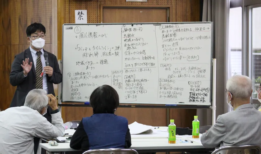 吉田准教授は今回の計画策定にあたり、河南町内の5地区すべてに訪問し、地域で行われている地域活動や福祉活動について取り上げたワークショップの講師も務めました。このワークショップでは、地域福祉計画をつくることが最終的な目的ではなく、地域そのものをどのようにつくるのかということについて伝えていきました。