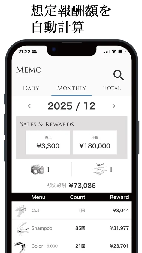 ・「施術件数」と「メニュー料金」から想定報酬額を算出。気になる相場をチェックできる機能。