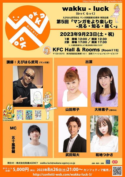 wakku-luck 第5回「マンガをより楽しむ –見る・知る・描く-」講師:えびはら武司 ゲスト:山田邦子・大林素子ほか出演で9/23開催決定!カンフェティにて8/26よりチケット発売