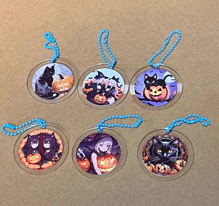 ハロウィンアートが入ったキーホルダーです。可愛い物からちょっと怖い物まで、TYPE-A~TYPE-Fまでの6種類用意しました。
