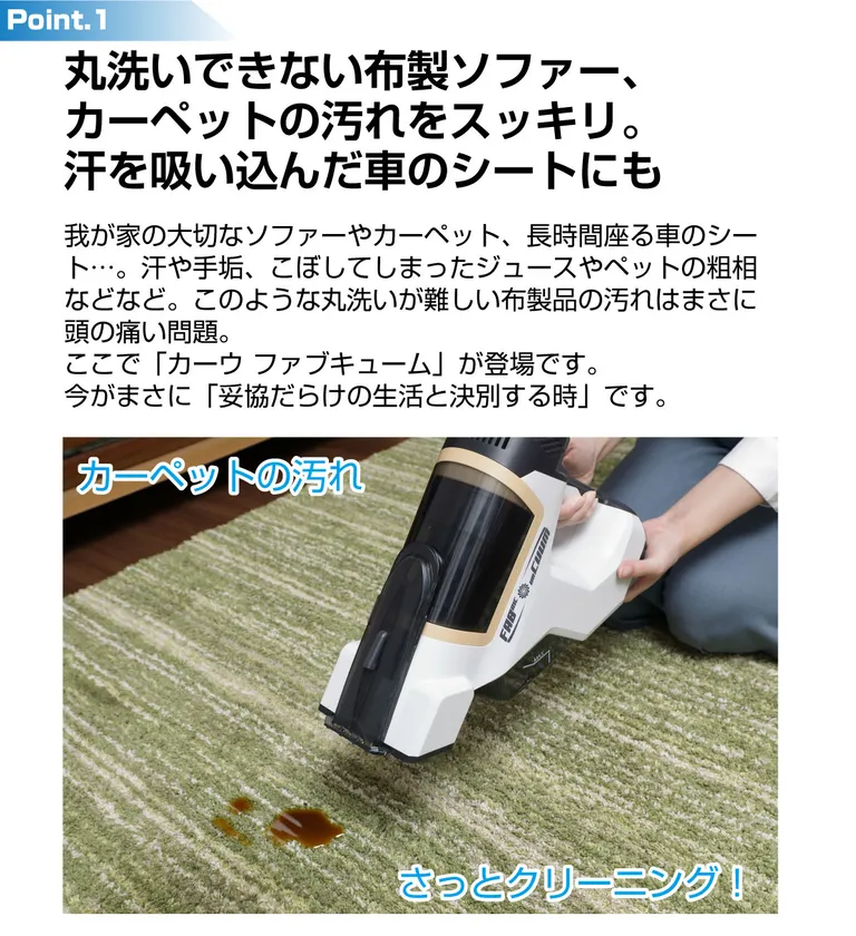 我が家の大切なソファーやカーペット、長時間座る車のシート…。汗や手垢、こぼしてしまったジュースやペットの粗相などなど。このような丸洗いが難しい布製品の汚れはまさに頭の痛い問題。
