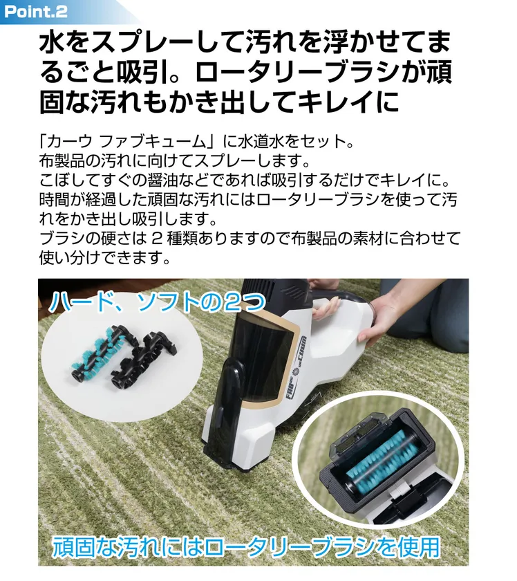 *【水をスプレーして汚れを浮かせてまるごと吸引】ロータリーブラシが頑固な汚れもかき出してキレイに